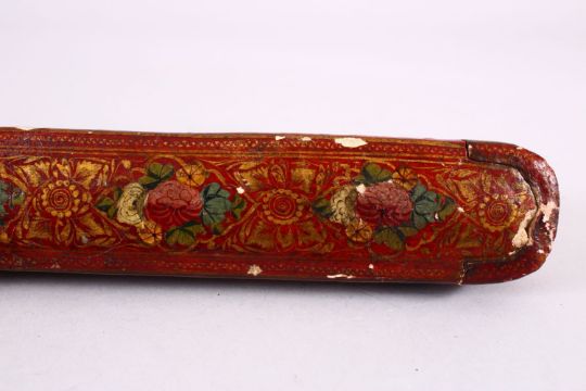 A 19TH CENTURY PRESIAN QAJAR LACQUER QALAMDAN PEN BOX, decorated upon a red ground with floral motif, 23cm.