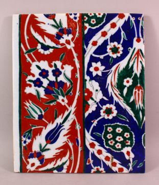 A TURISH IZNIK STYLE POTTERY TILE SECTION, with floral decoration, 33cm x 27cm
