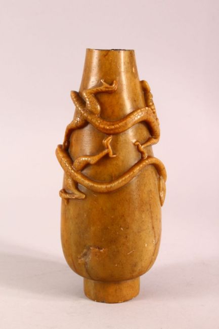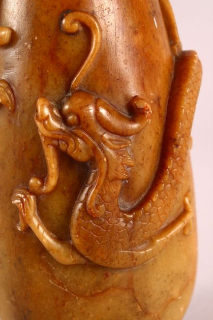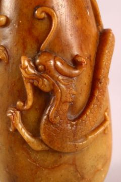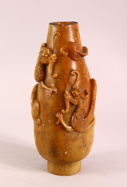 A CHINESE CARVED SOAPSTONE VASE, carved with dragons to the body, 23cm