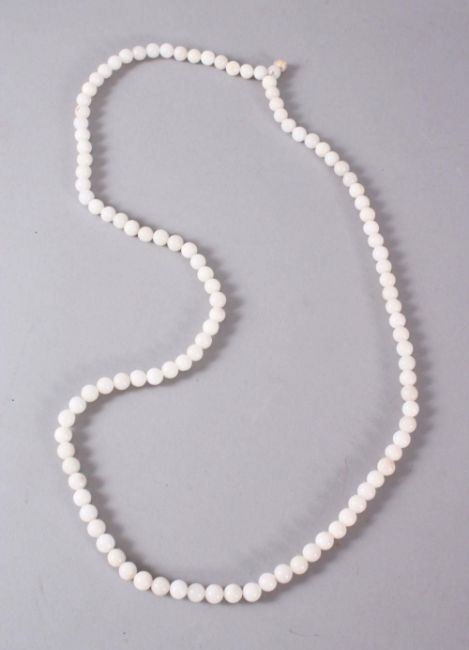 A GOOD SET OF CARVED WHITE JADE ROSARY BEADS, comprising 109 spherical carved beads, 92cm open approx.