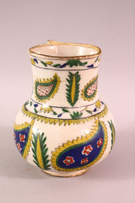 AN OTTOMAN KUTAHYA POTTERY JUG, with floral motif decoration, 12cm