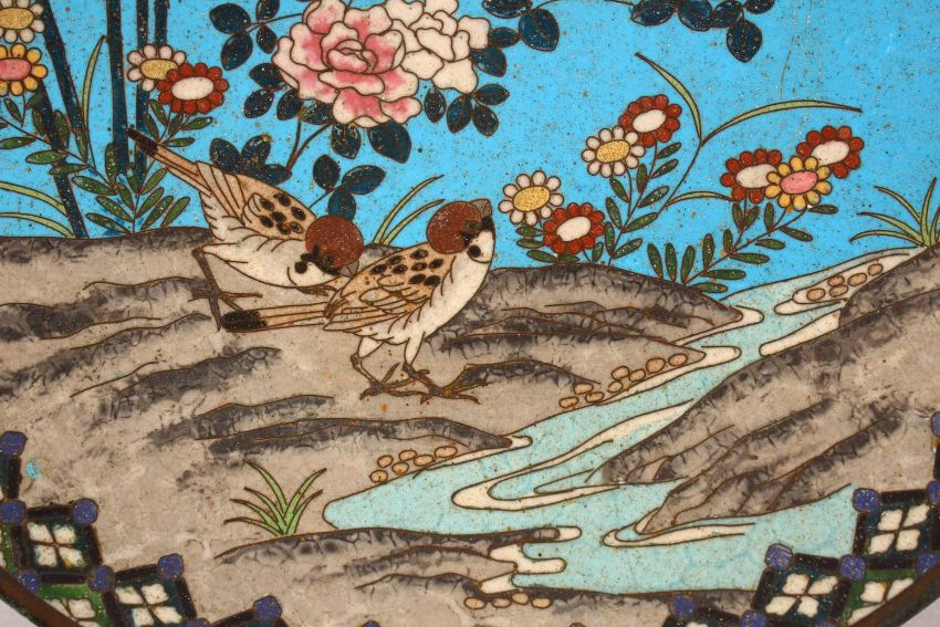 A CLOISONNE CIRCULAR DISH, depicting birds and flowers by a stream, 30cm diameter.