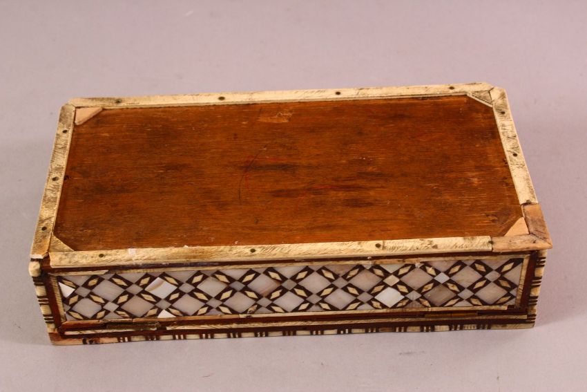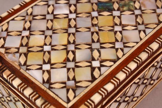 A JUDAICA JEWISH INLAID PEARL WOODEN LIDDED BOX, 21cm x 11cm