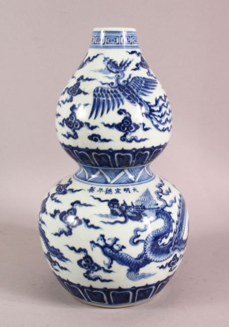 A CHINESE BLUE & WHITE DOUBLE GOURD PORCELAIN VASE, the body with a dragon and phoenix with clouds, with a six character mark, 32cm.