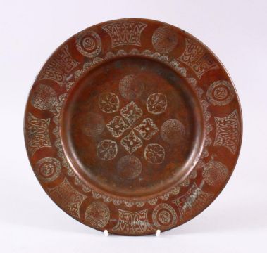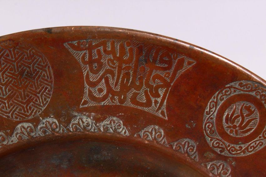 A 19TH CENTURY ISLAMIC CALLIGRAPHIC COPPER DISH, with floral motif and panels of calligraphy, 24cm diameter.