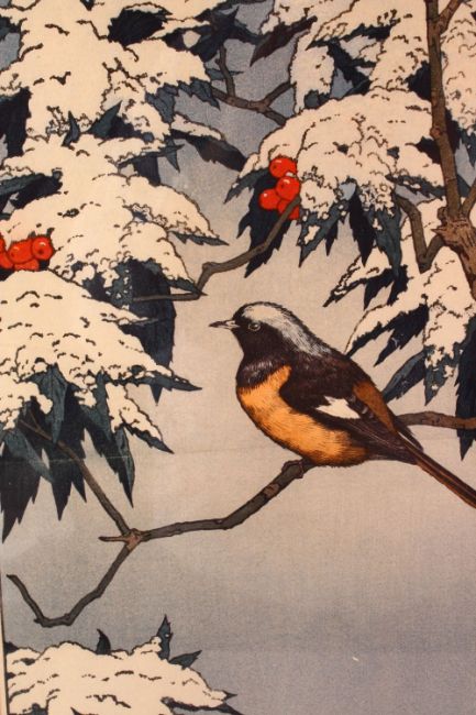 A LARGER JAPANESE WOODBLOCK PRINT BY TOSHI YOSHIDA 1911 - 1995, sitting under snow covered leaves - winter, cut and restored, framed 78cm x 40cm