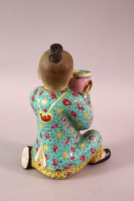 A CHINESE FAMILLE ROSE TURQUOISE GROUND PORCELAIN FIGURE OF A BOY, the boy knelt holding a basket, the base ink signed, 16cm