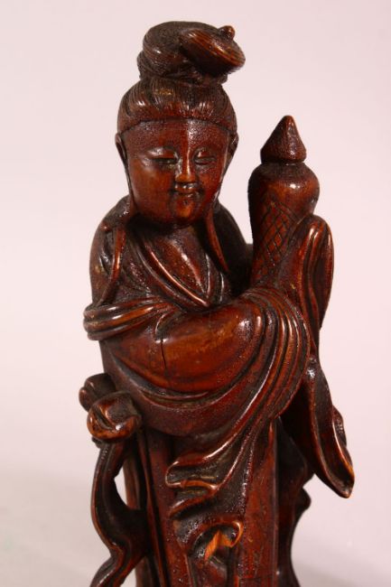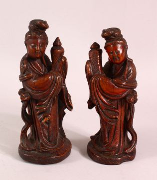 A PAIR OF 19TH CENTURY CHINESE CARVED WOOD FIGURES, 22CM
