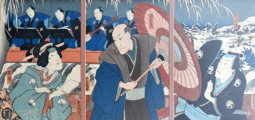 A set of three late 19th Century Japanese woodblock prints, framed as a triptych, each panel 15" x 10" (38 x 15 cm).