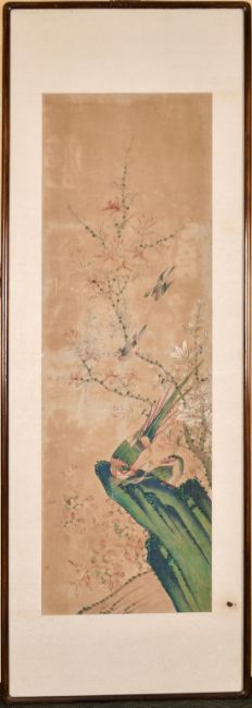 Korean School, 19th Century, A Triptych of traditional scenes of birds amongst blossoming foliage, ink and watercolour on silk, set of 3, each 40" x 12.5" (101 x 32 cm).