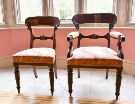 A VERY GOOD SET OF SIXTEEN WILLIAM IV MAHOGANY DINING CHAIRS, CIRCA. 1835, two with arms, padded seats and fluted legs.