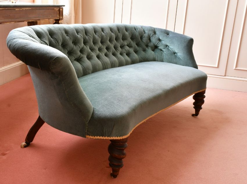 A VICTORIAN SHAPED BUTTON BACK SETTEE on turned legs and castors. 4ft 9ins long.