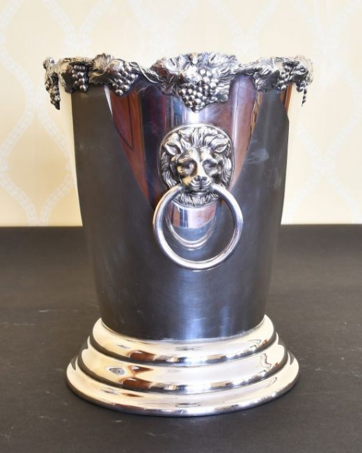 A SILVER PLATE TAPERING ICE BUCKET with lion ring handle.