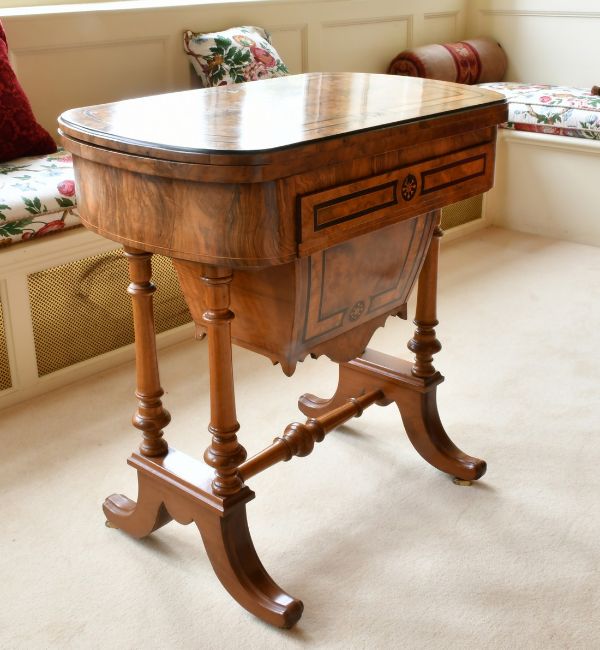 A GOOD VICTORIAN WALNUT GAMES AND SEWING STAND, the folding top opening to reveal backgammon, cribbage and chess, with a sewing bag, on turned supports with curving legs and castors. 2ft 4ins long x 1ft 4ins wide x 2ft 4ins high.