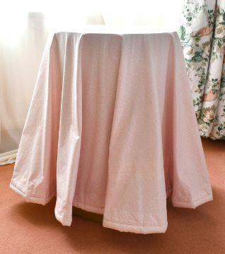 A SMALL CIRCULAR TABLE with fabric cover. 1ft 5ins diameter.