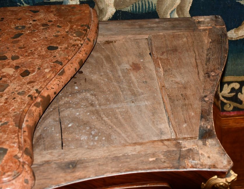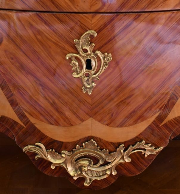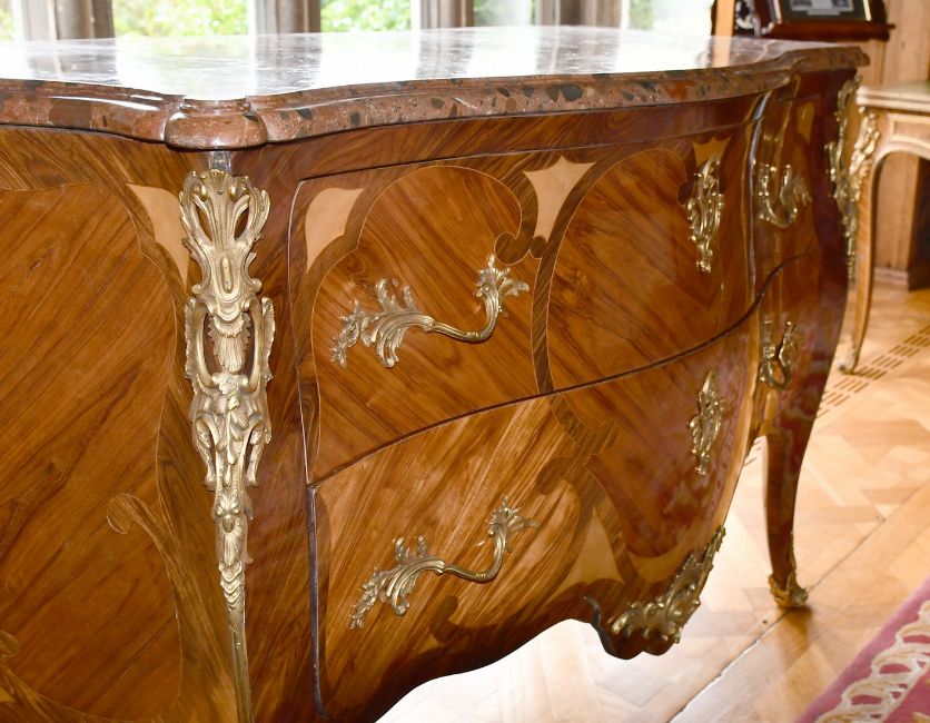 A VERY GOOD LOUIS XV KINGWOOD, TULIPWOOD AND SYCAMORE COMMODE, CIRCA. 1740-4750, in the manner of Jean-Baptiste Fromageau, with serpentine marble top, two deep bombe fronted long drawers with ormolu handles, on curving legs. 4ft 8ins long x 2ft 1ins wide x 2ft 11ins high.Provenance: GILLES LINOSSIER, PARIS.