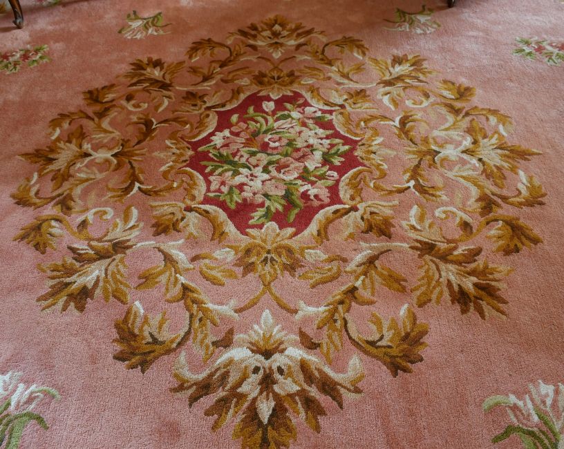 A LARGE FRENCH AUBUSSON WOOL CARPET, Made by TAI PING CARPETS OF HONG KONG, CIRCA. 1990, with pink ground with large central floral motif. 21ft 6ins long x 12ft 6ins wide.