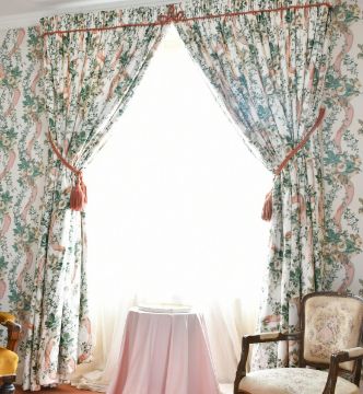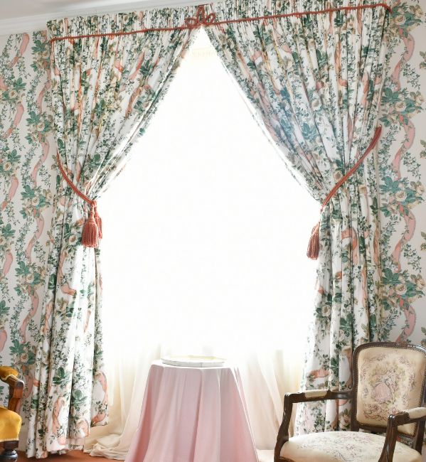 TWO PAIRS OF FLORAL FULL-LENGTH CURTAINS, PELMETS AND MIRRORS. 1ft 2ins diameter.