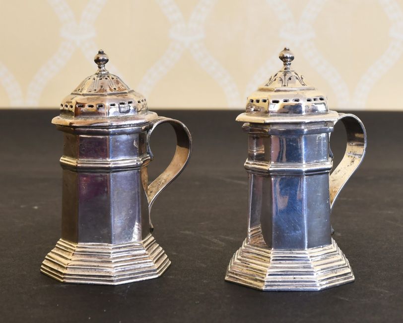 A PAIR OF OCTAGONAL SILVER PEPPERETTES with handles.London 1940.