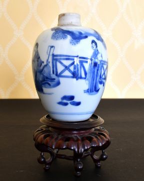 A KANG HSI BLUE AND WHITE VASE painted with figures and fence. 6ins high, on a wooden stand.