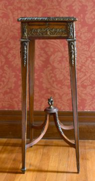 A 19TH CENTURY FRENCH SQUARE MARBLE TOP STAND on tapering legs with cross frame stretcher. 2ft 10ins high.