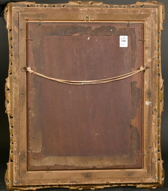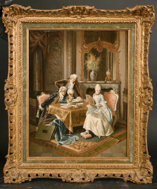 19th century Continental school, Figures in a lavish interior with a flirtatious couple, oil on mahogany panel, 16" x 12.25".