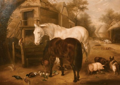 Circle of J. F. Herring jr., Horses ducks and pigs in a farmyard setting, oil on canvas, 19.5" x 26".