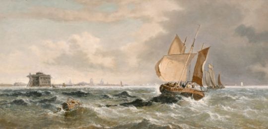 Attributed to Arthur Joseph Meadows (1843-1907) 'Mackerel boats Nearing the Port Of Calais', oil on canvas, signed and with remanence of label verso, 12" x 24".