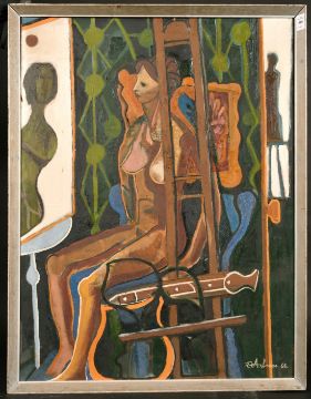 Ray Ambrose (1926-1989) British, 'Girl in a Studio', A female nude in the artist's studio, oil on board, signed, label verso, 30" x 24".