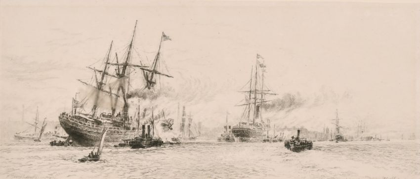 W. L. Wyllie (1851-1931) British, An etching of shipping on a busy river, 4.75" x11".