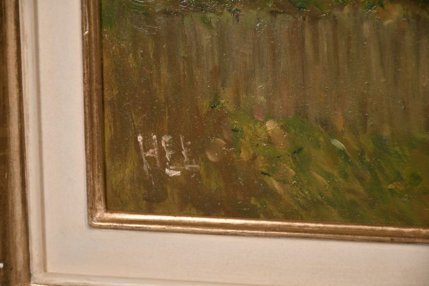H. E. Lewis, woodland cottage, oil on board, signed with initials, 18" x 21.5".