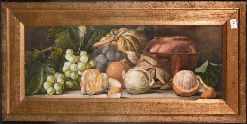 Arthur Dudley (1864-1915) A still life of mixed fruit and trailing vines, watercolour, signed, 10" x 29".