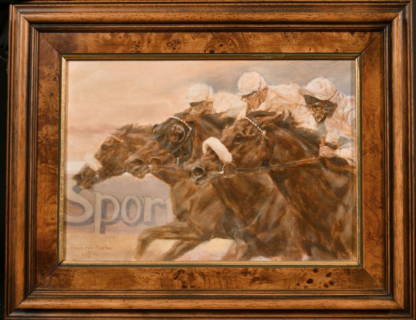 Claire Eva Burton (b. 1955) A scene of three horses and their jockeys heading for a close finish, oil on canvas, signed and dated '1984', 8.5" x 12".