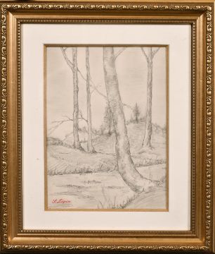 WITHDRAWN Attributed to Stanislas Lepine (1835-1892) French, A study of trees along a riverside, pencil with studio stamp, 9.5" x 6.5".