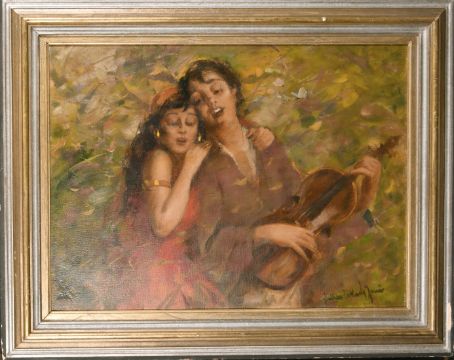 Jeno Dukai Takach (1888-1956) Hungarian, A scene of two females singing with one holding a violin, oil on canvas, signed, 23.75" x 31.5".