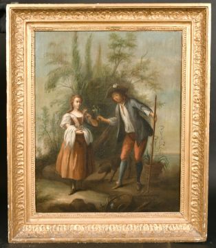 Late 18th/Early 19th century continental school, A scene of a young gardener giving a lady a flower, oil on canvas, 22.5" x 18", in a period frame.