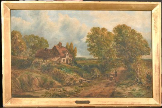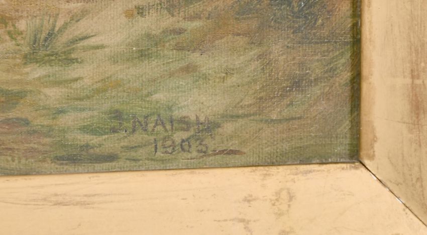 J. Naish, circa 1903, 'Lane Near Coleshill', A wayfarer on a country path by a cottage, oil on canvas, signed and dated, 16" x 26".