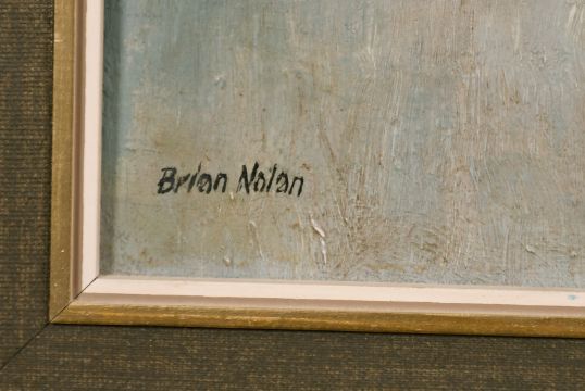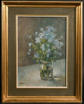 Brian Nolan 20th century British school, A still life of blue flowers in a glass vase, oil on board, signed, 15" x 10".