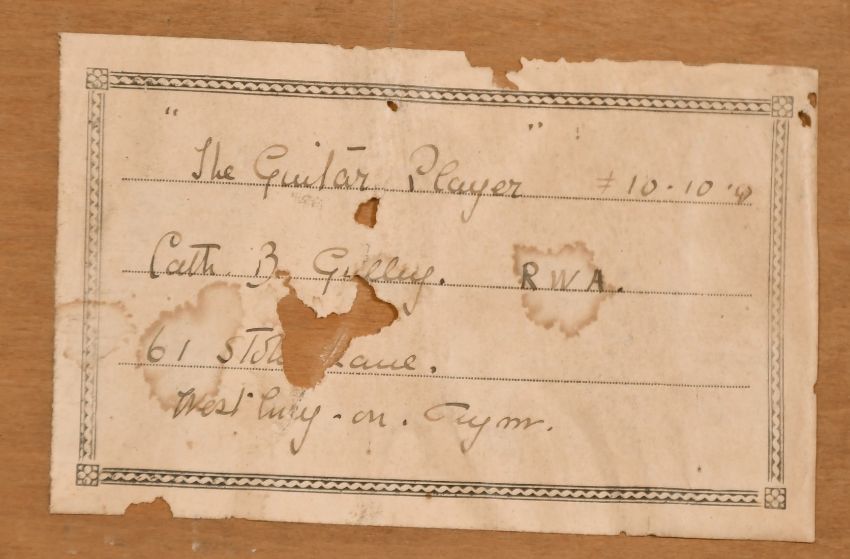 Catherine B. Gully (early 20th century) British, 'The Guitar Player', A lady in a lavish interior, watercolour, signed with exhibition label verso, 21.5" x 14.5".