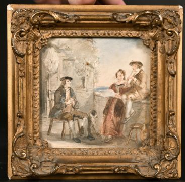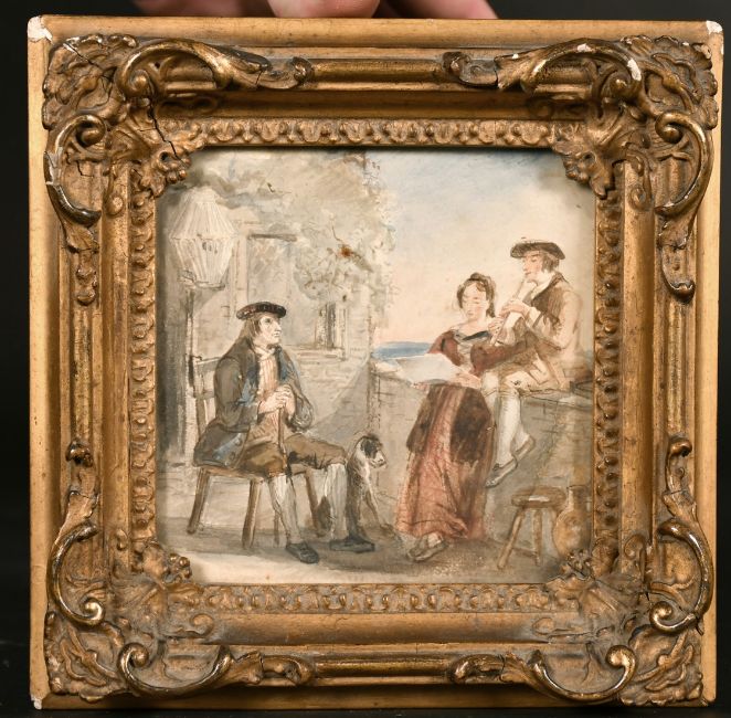 Circle of Thomas Faed, figures on a balcony playing music, watercolour, 4.5" x 4.5".