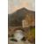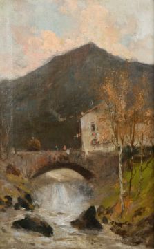 Continental school, A scene of figures on a stone bridge on a waterfall, oil on canvas, 15.5" x 10".