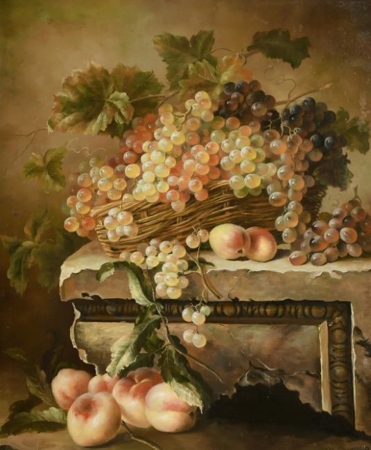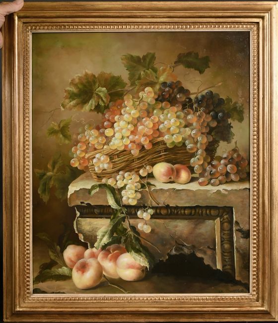 20th century, A still life of fruit, grapes and trailing vines, oil on panel, signed 'W. Cooper', 24" x 20".
