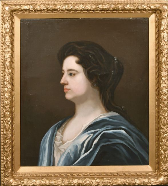 Early 19th century, A head and shoulders portrait of a lady in profile, oil on canvas, 24" x 20", (A/F), in a fine gilt composition frame.