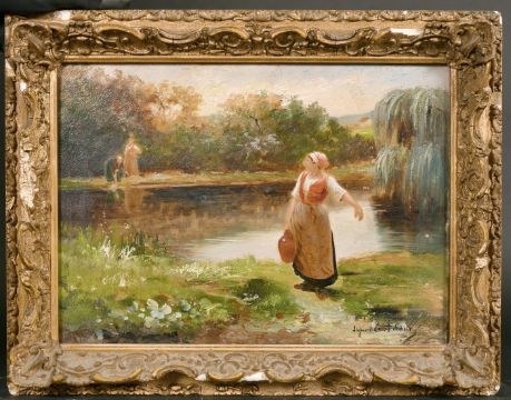 Late 19th century French school, Washerwoman collecting water, oil on canvas, indistinctly signed 'S... E. Adam', 9.5" x 13".