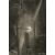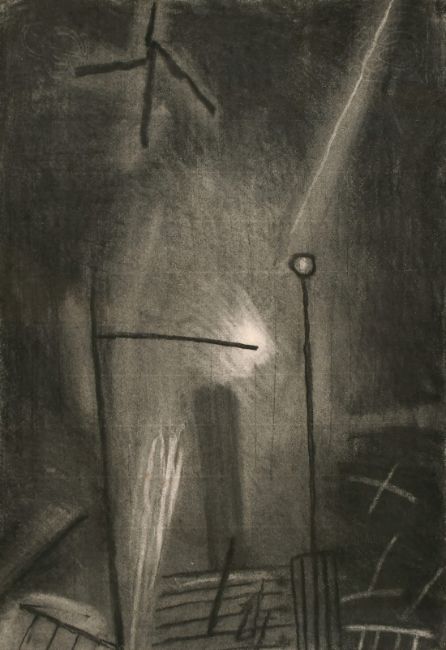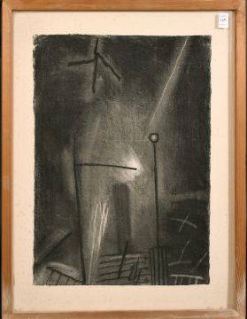 Mid-20th century, stylised barn interior, charcoal, 20.5" x 15.5".