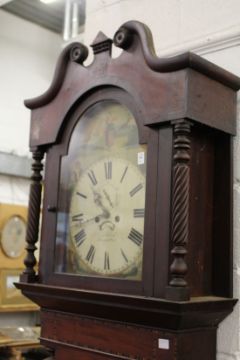 A large 19th century mahogany longcase clock with painted arched dial signed R Hughes Llangollen (?)