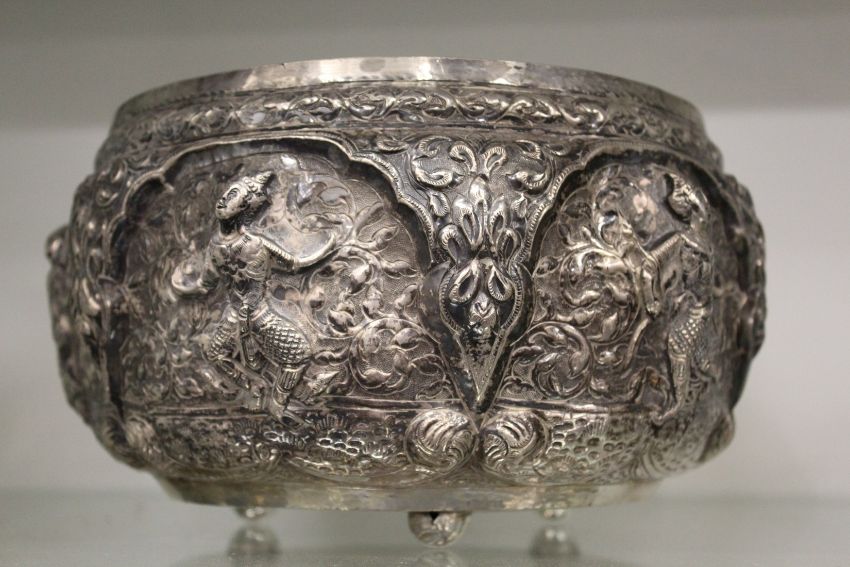 A good Burmese deity bowl, probably silver embossed and chased with figures and foliate design