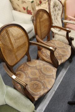 A pair of French style walnut framed open armchairs with canework backs and drop-in seats