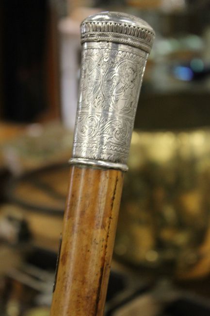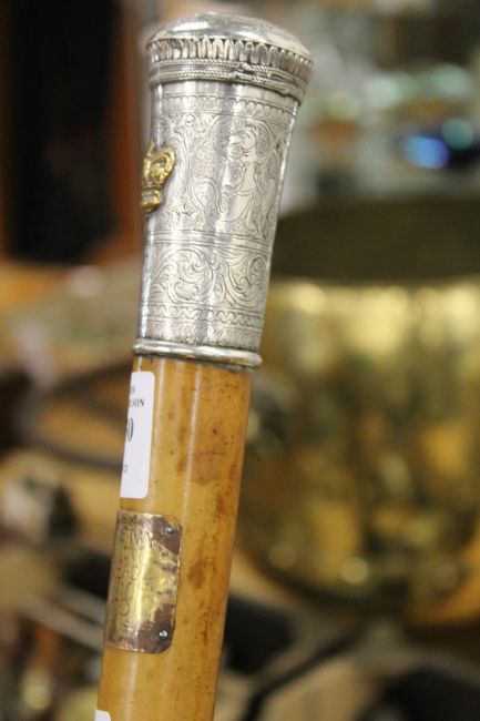 A very good silver topped malacca walking stick with engraved decoration and applied crown
