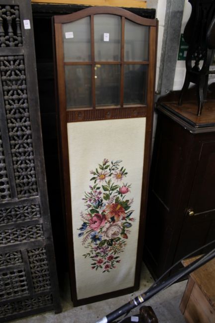 A mahogany folding dressing screen with part glazed and embroidered panels